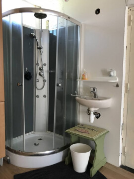 Het toilet ligt buiten de studio in een ruimte samen met de wasmachine (in de gezamenlijke entree/hal).