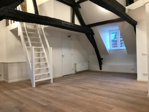 Dit studio appartement is op de 3de verdieping gelegen en kenmerkt zich door de hoge plafonds, prachtige balkenconstructie en schitterende houten vloer in het gehele appartement. De moderne, separate keuken is v.v. een koel/vries combinatie, 4 pits kookplaat, Combi oven, vaatwasser en afzuigkap. De moderne badkamer is voorzien van design radiator, zwevend toilet, wastafel en douche. Via de witte trap is er nog een slaapvide te bereiken van ca 6,5 m2. Verder is er nog een walkingcloset (3,5m2) met de witgoed aansluiting en eigen CV ketel.