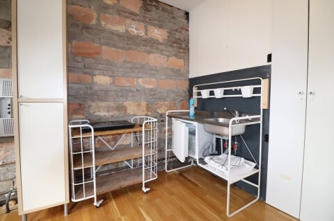 Met een gezamenlijke ingang (die gedeeld word met de eigenaresse) betreed u de studio via een prachtige wenteltrap, die als volgt is ingedeeld: Keuken met een wastafel, ijskast, 2 pits elektrische kooktoestel en diverse opbergkastjes. De keuken is voorzien van een laminaat vloer en heeft een oppervlakte van 9m2.