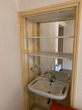 Deze volledig opgefriste Studio ligt op de eerste verdieping en heeft een totale oppervlakte van 26 m². De slaapkamer met eigen wastafel en douche heeft een oppervlakte van 8 m². De woonkamer met open keuken is vrij ruim met 18 m² aan oppervlakte. De open keuken is ook voorzien van een inbouw koelkast, afzuigkap en een elektrische kookplaat.