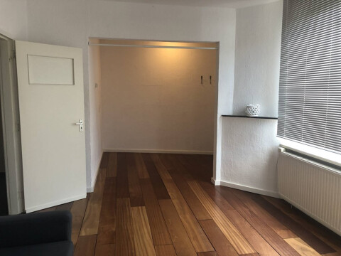 Aangrenzend aan de woonkamer bevindt zich de slaapkamer van 9 m2. Deze is gelegen aan de achterzijde en beschikt over dezelfde parketvloer als de woonkamer.