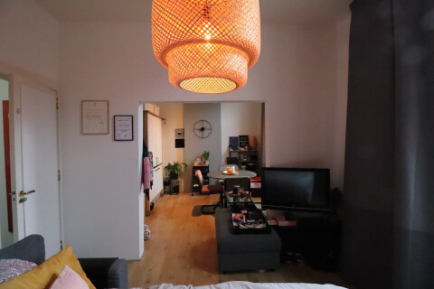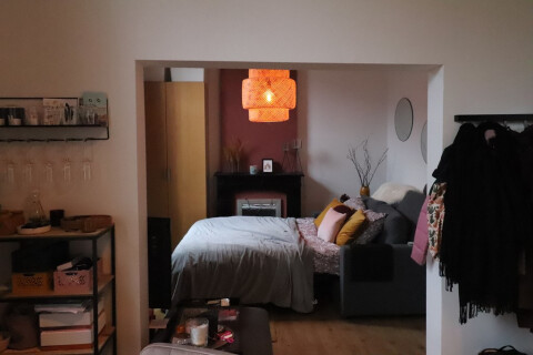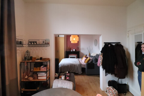 De studio beschikt over een ruime voorkamer (woon-slaapkamer) van 13 m2. Deze is voorzien van een nette laminaatvloer.