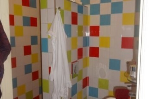 De privé badkamer aan overzijde op de gang is 3m² en beschikt over een inloopdouche, wastafel met fontein en een toilet.